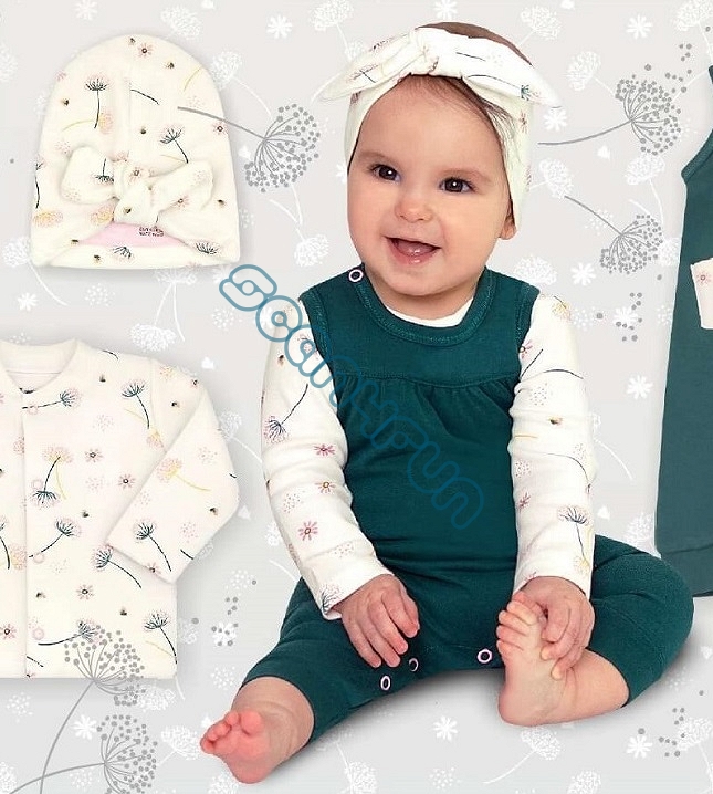 Dla dziewczynek producent NiNi przygotował piękne ubranka niemowlęce w kolorach ecru i butelkowej zieleni, z dodatkiem nadruków w kwiatki.